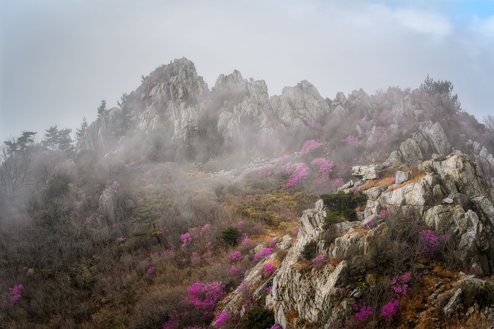 올해 첫 봄 산행지 주작산 봄풍경입니다. 안개 기대로 오전내내 기다려 담았습니다.
